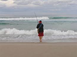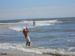 Surf fishing is the sport of catching fish standing on the shoreline or wading in the surf. A general term, surf may or may not include casting a lure or bait, and refers to all types of shore fishing - from sandy and rocky, rock jetties, or even fishing piers. The terms surfcasting or beachcasting refer more to surf fishing from the beach by casting into the surf at or near the shoreline. With few exceptions, surf fishing is in saltwater.